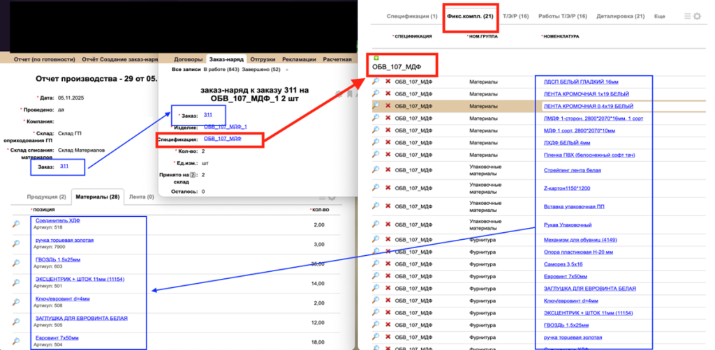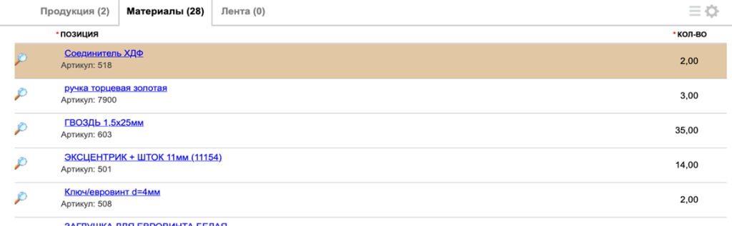 Кол-во Заполняется кол-вом фиксированных комплектующих в изделии согласно Спецификации* кол-во принятых упаковок. Отражает кол-во списанных материалов для производства готового изделия.