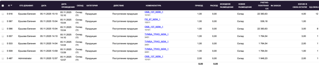 Записи "приход" по готовым изделиям из подтаблицы "Продукция" в Отчёте пр-ва за смену: