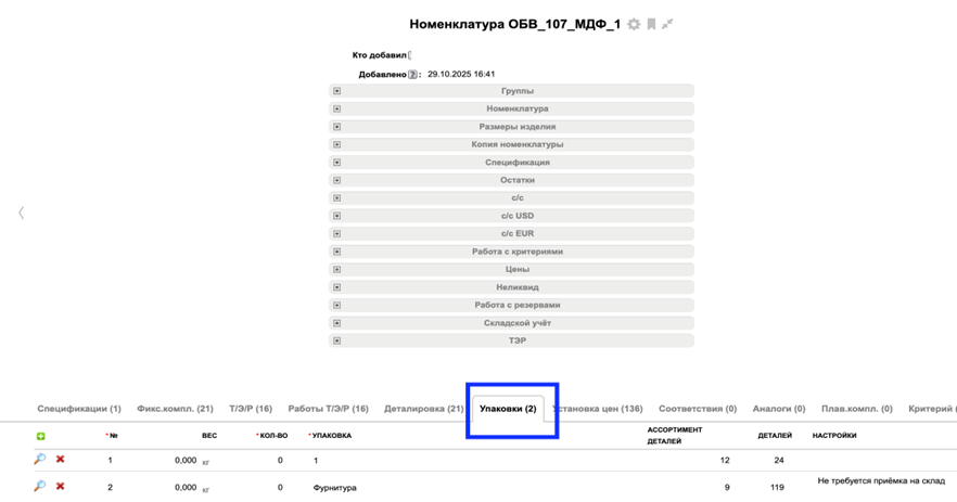 Упаковки, из которых состоит готовое изделие, указываются в подтаблице "Упаковки" в "Номенклатуре":