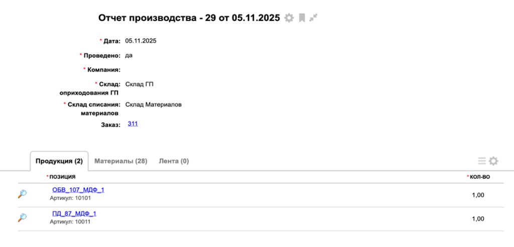Позиция Заполняется автоматически материалами из фиксированных комплектующих изделия (в справочнике "Склад номенклатуры") согласно Спецификации, указанной в заказ-наряде. Отражает списание материалов, необходимых для производства готового изделия.