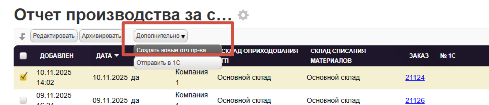 При необходимости отчет можно сформировать вручную. Для этого в списке выделить какую-либо запись и нажать "Дополнительно-Создать новые отчеты пр-ва":