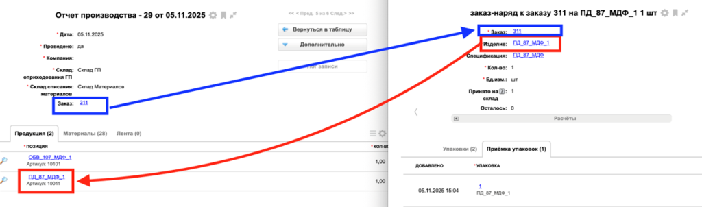 2.1. Запись в таблице "Отчёт пр-ва за смену" создается, если в Заказ-наряде появились новые принятые упаковки, необходимые для комплектации готового изделия.