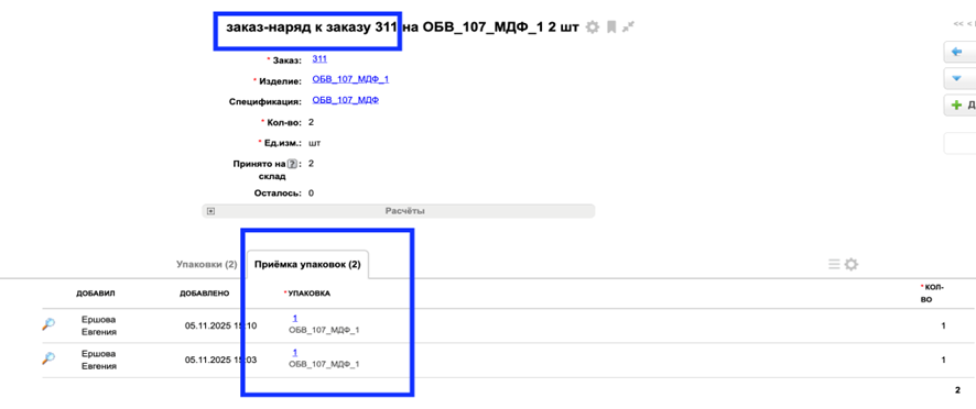 Приёмка упаковок фиксируется в подтаблице "Приёмка упаковок" к таблице "Заказ-наряд".