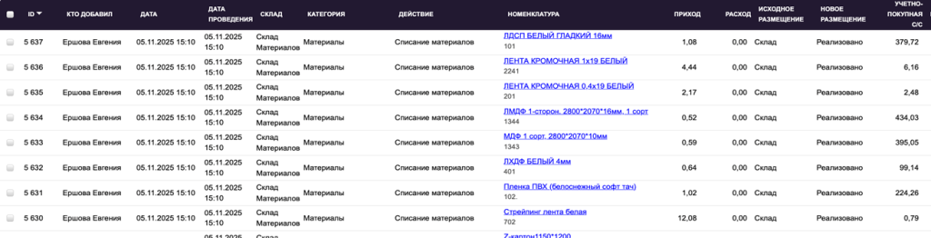 Записи "расход" по материалам из подтаблицы "Материалы" в Отчёте пр-ва за смену: