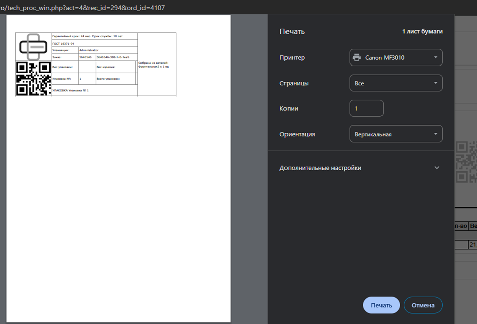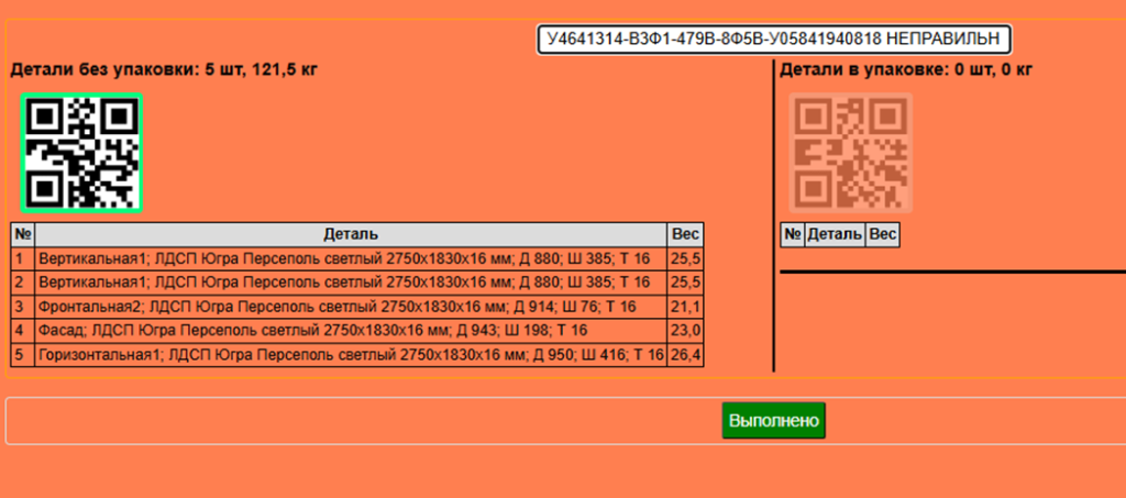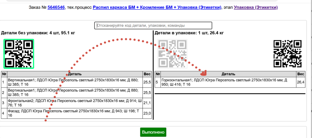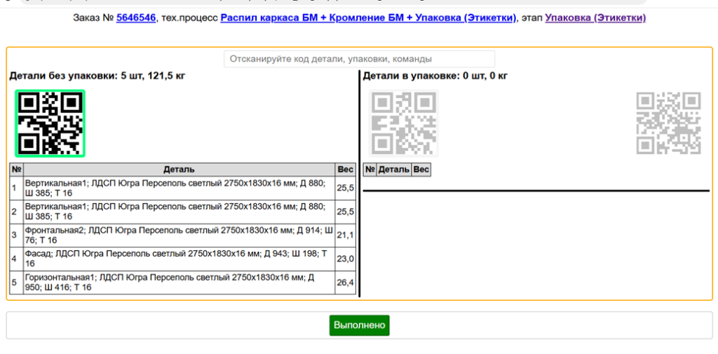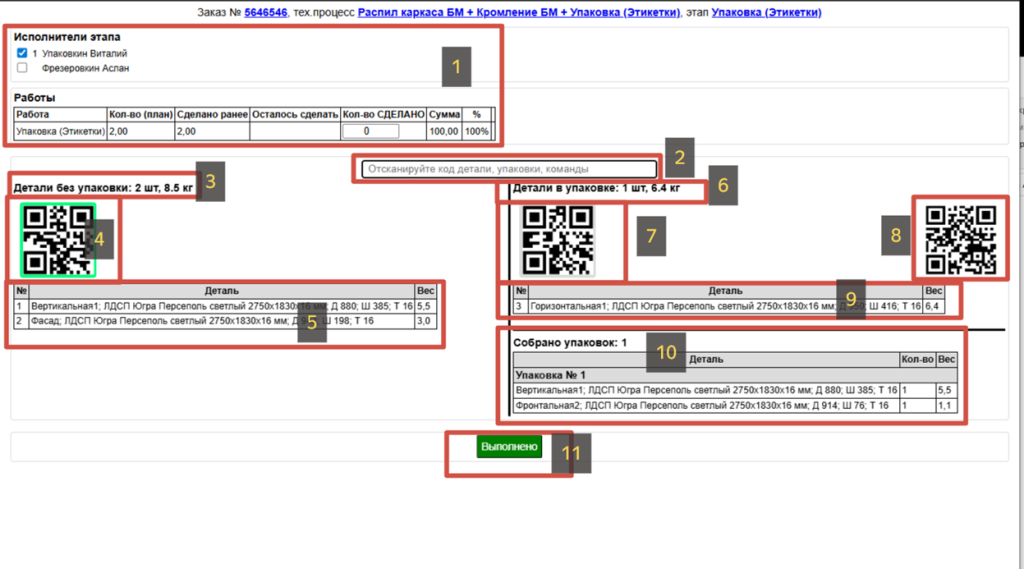 7. QR - команда для готовности упаковки. По умолчанию qr-код серого цвета, НЕ активен (так как нет готовых для упаковки деталей). Если он активен, то qr-код становится черного цвета. Чтобы создать упаковку, нужно просканировать qr-код, либо нажать 2 раза левой кнопкой мышки.