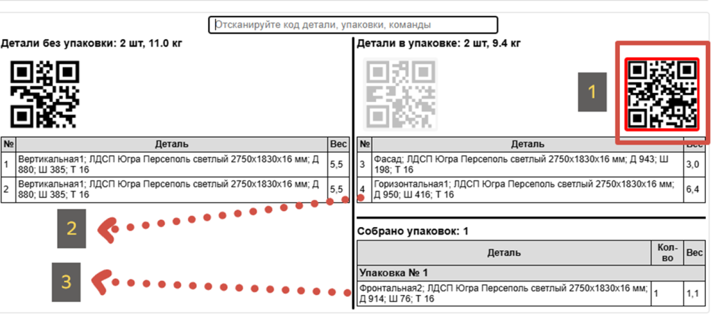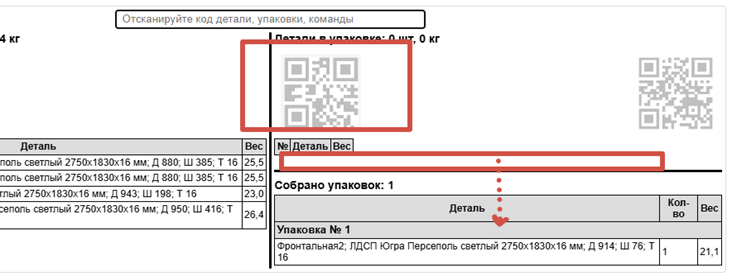 В системе Бизнес в плюсе есть возможность создавать упаковки с помощью сканирования QR-кода деталей.