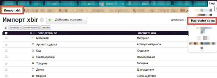 В Настройках пр-ва в таблице «Импорт xbir» добавляем позиции. Указываем, какое название из файла будет соответствовать полю в Бизнес в плюсе.