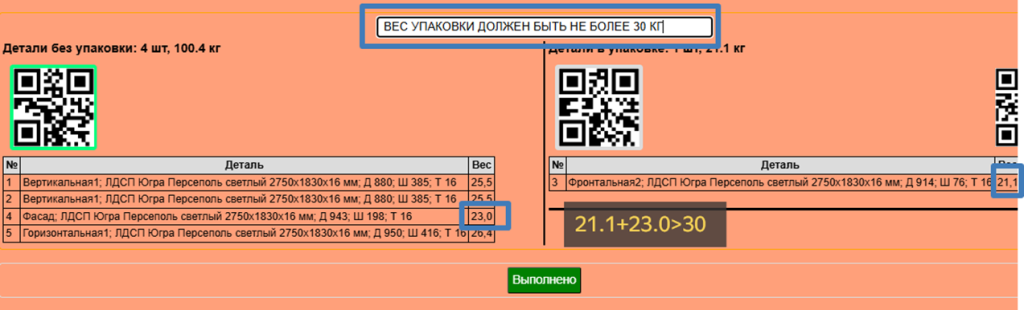 Происходит проверка веса уже готовых деталей плюс то, что пытаемся добавить. Если идет превышение (указываем в таблице «Справочник Этапы» в поле «Максимальный вес упаковки»), то в поле работы со сканером появляется предупреждение: