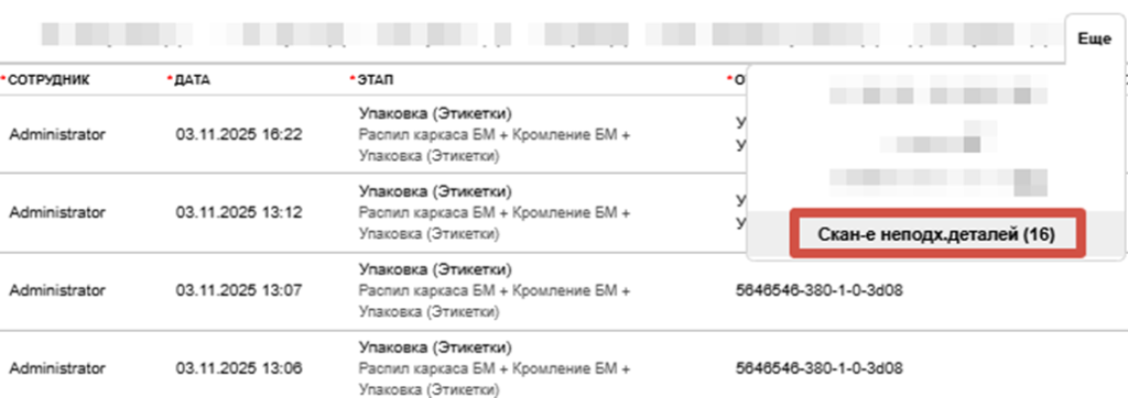 Сканирование неподходящих деталей. Используется для фиксирования деталей, qr-код которых был отсканирован, но детали не относятся к данному заказу. В данном поле есть возможность выбрать значения: