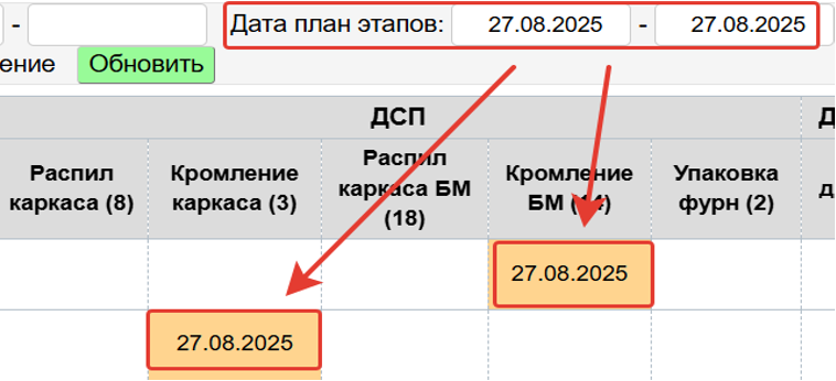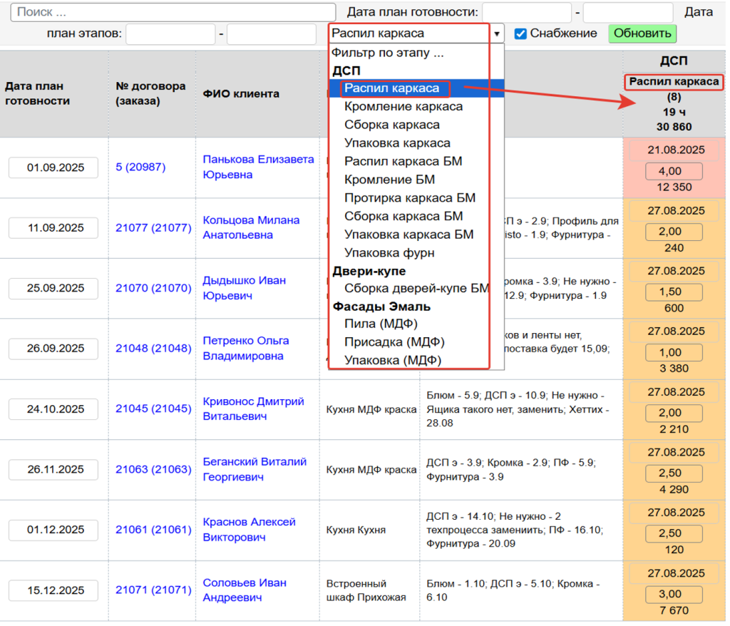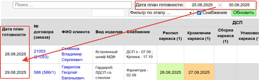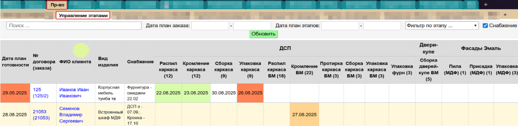 Активный поиск и фильтры по Дате план готовности, по Дате план этапов, по Этапу. Это позволяет легко формировать нужные данные. |