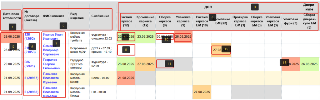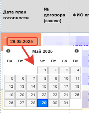 5. Дата план готовности. В случае просрочки поле подсвечивается красным цветом. При наведении отображается информация о дате готовности по договору. |
