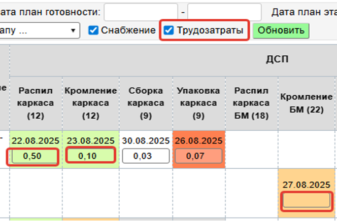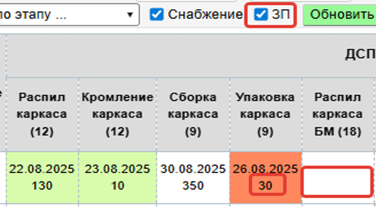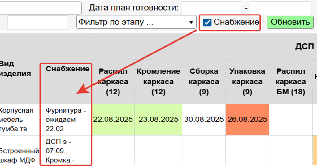 Отображение информации по обеспечению заказа позволяет оценить возможность выполнения этапа. |