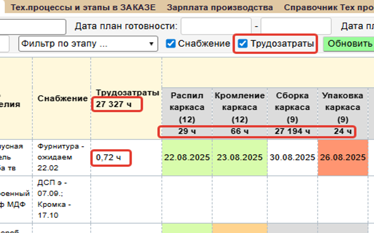 Если у сотрудника установлена эта настройка, в отчете в верхнем блоке появляется поле Трудозатраты с установленным флагом. Появляется столбец Трудозатраты с указанием общего количества времени на выполнение всех невыполненных этапов и по заказам. Отображается трудозатраты по каждому этапу.