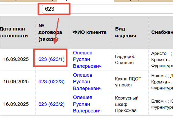 7. ФИО клиента. При наведении курсора подсказка - Открыть отчет по готовности. При нажатии в новом окне отображается заказ в Отчете (по готовности). |