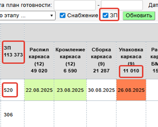 Если у сотрудника выбрана эта настройка, появляется поле ЗП в верхнем блоке с установленным флагом. Появляется столбец ЗП с указанием общей суммы зарплаты на выполнение всех невыполненных этапов и по заказам. Отображается зарплата по каждому этапу.