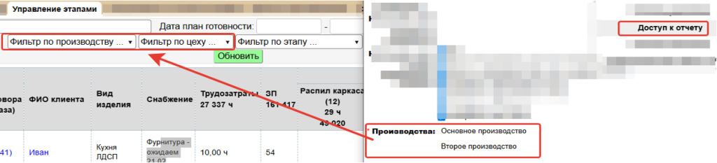 При указании доступа к нескольким производствам, появляется возможность в фильтре выбирать производства и цеха.
