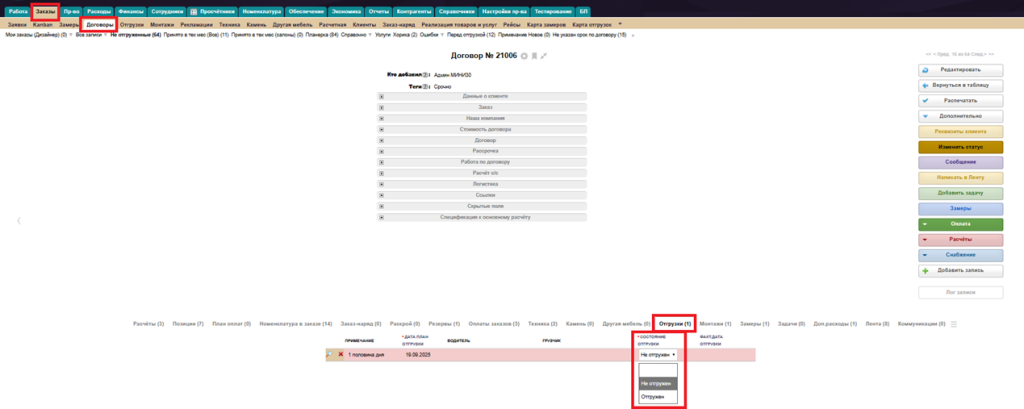 8. После того, как заказ отгружен, в таблице "Договоры", подтаблица "Отгрузки", отобразится отметка о состоянии отгрузки, где водитель или другой ответственный сотрудник устанавливает статус "Отгружен". Данный рейс завершен.