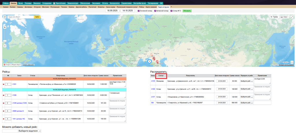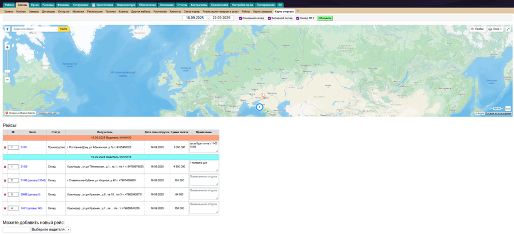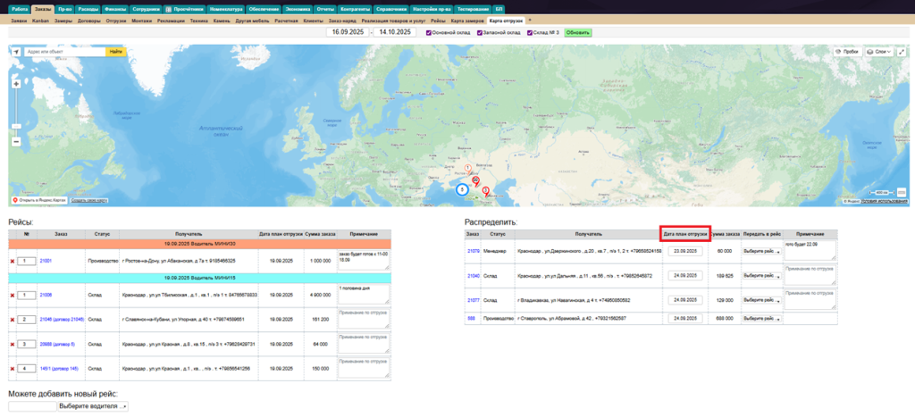 После создания рейса можно на карте отмечать заказы, которые будут отгружены водителем в этом рейсе.