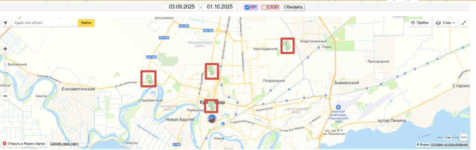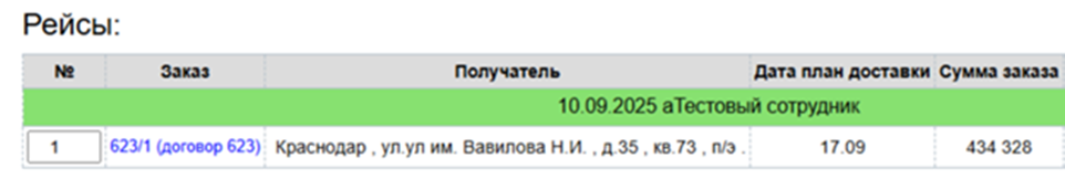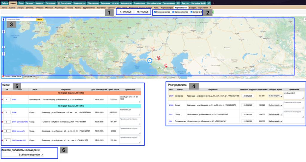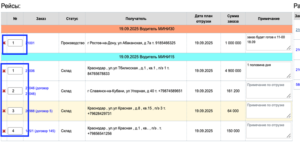 После того, как во всех заказах будет выбран рейс, они отобразятся в карте с порядковым номером отгрузки, и Водителю будет понятно, в каком порядке развозить заказы.