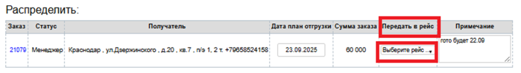 В таблице "Распределить" есть возможность указать "Примечание" при необходимости и/или изменить Дату план отгрузки. Данный комментарий далее отображается в таблице "Отгрузки" и будет виден водителю.