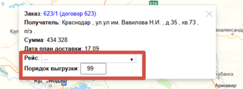 Выбираем рейс из списка, а также проставляем порядок выгрузки заказа.
